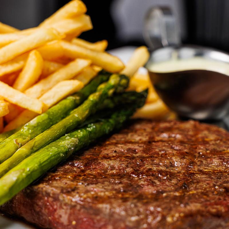Grilled 10 oz Flat Iron Steak, Wild Arugula, Truffle Vinaigrette, Choice of Fries
