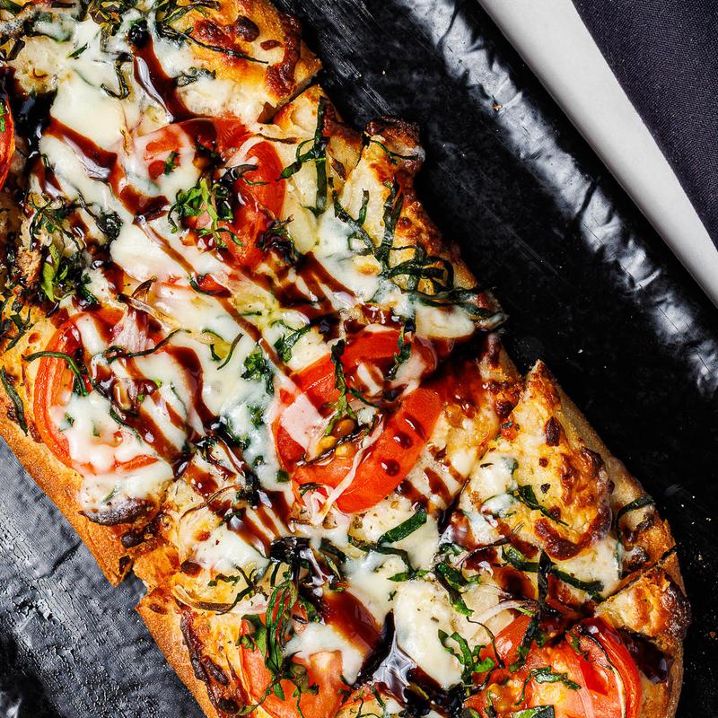 Black Pepper Mascarpone, Roma Tomato, Red Onion, Baby Spinach, Mozzarella, Balsamic Glaze